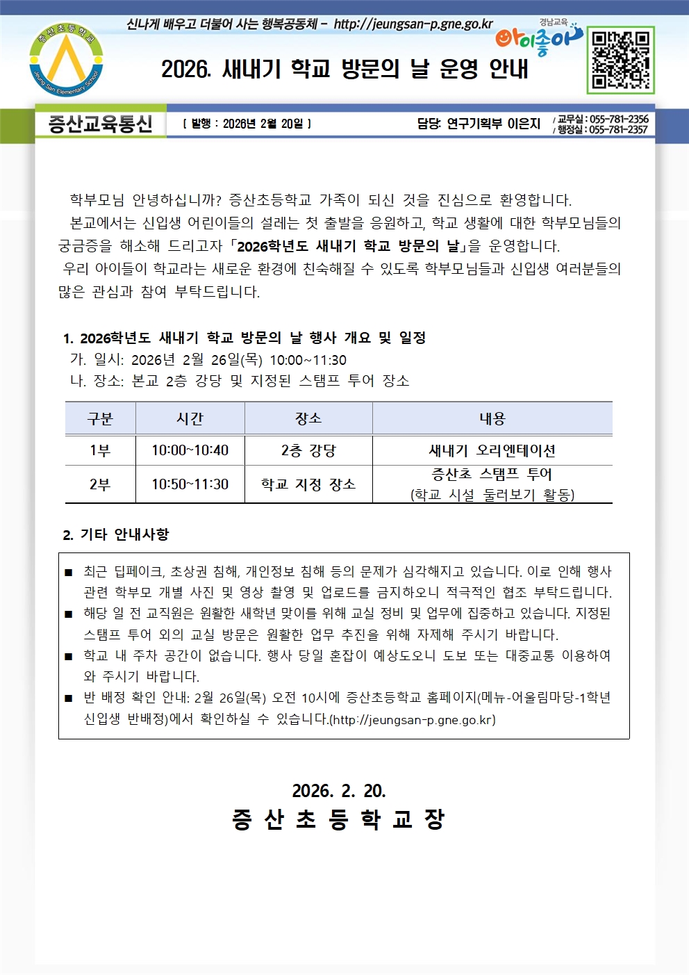 2026. 신입생 및 학부모 대상 새내기 학교 방문의 날 운영 안내