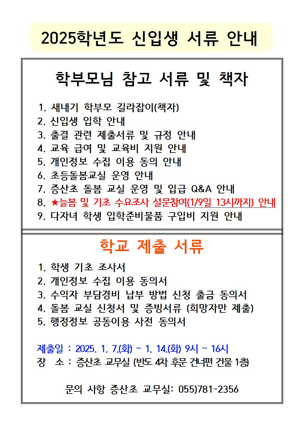 1) 필수 제출 서류 및 선택 제출 서류는 추후 1월 7일(12시 이후) ~ 1월 14일까지 증산초 교무실로 제출하셔야 합니다.